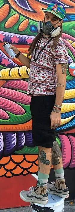 Chris Dyer (born March 3, 1979) is a Peruvian–Canadian artist based in Montreal. Some of his broader artistic themes include consciousness, truth, oneness, introspection, personal development and kindness.[1] He paints using acrylic, pencil, pen, spray paint, gouache and other media on a variety of different forms, including broken or blank skateboards in his early years, various sculptured and recycled items, and now commonly fabric or wood canvas. He is also known for his murals, logos, album covers, posters, illustrations, comic books, travel diaries,[2] and YouTube adventure vlogs.[3]