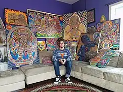 Dyer started his freelance art career locally, by doing art exhibitions in Montreal. It did not take too long until his work started getting featured in magazines like Thrasher[11] and High Times. This exposure got him further commercial commissions, along solo exhibitions in places like Peru, Mexico, Belgium and all across the United States and Canada. To this point, he has exhibited at galleries around the world, including Vienna, Bali, Costa Rica, Spain, Paris, Berlin, Tokyo, New York City, Denver and Los Angeles.[12] He has shown with renowned artists such as Alex Grey, Shepard Fairey, Robert Venosa, H.R. Giger, and Romio Shrestha. He has also worked with skateboard art legends like Jim Phillips, Wes Humpston, and Andy Howell. Other than exhibiting he also travels to live paint at events and big music festivals like Burning Man (Nevada), Shambhala (British Columbia), and Boom (Portugal).