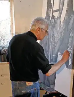 Also in 2009, after nine years in the making, Gollon's series of paintings of the Fourteen Stations of the Cross was installed in the Church of St John on Bethnal Green in East London. They were blessed by the Bishop of London, Richard Chartres, in March 2009. In the same month, British novelist Sara Maitland's book Stations of the Cross, inspired by and featuring Gollon's paintings, was published.[24] The book also contains a text by Fr Alan Green about the story of the commission and his personal collaboration with the artist. To bring the story closer, Gollon used his own son as the model for Jesus, his daughter as Mary, and Fr Alan Green as Nicodemus. Gollon's Fourteen Stations of the Cross are site-specific and permanently installed. They are both an active aid to worship and also make the Church of St John on Bethnal Green a visitor attraction in East London.[25]