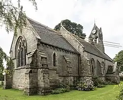 It is built in sandstone with a Welsh slate roof, and consists of a nave, a north porch, and a chancel with a south vestry. On the west gable is an open double bellcote. The north doorway incorporates a Norman doorhead, with a tympanum containing a cross in a roundel. Inside the church is a re-set Norman doorway with three orders of shafts. The window heads in the vestry are 14th century, as is the font, while one bell is believed to be 12th century.[1][5]