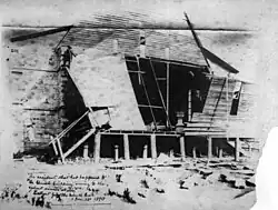 The stump capping ceremony took place on 4 June 1891.[2] The building was opened and dedicated by Bishop Webber on 18 September 1891.[3] The new church/hall building was placed on a different location within the allotment to the existing church as this continued in use while the hall was built. Some furnishings were transferred, including a stone baptismal font donated to the first chapel by Andrew Petrie. Due to the financial constraints under which the church was operating, and the original perception of the place as principally serving as a Sunday School, many of the furnishings of the church were added later. The roof was originally clad in timber shingles.[1]