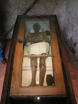 During the Napoleonic Wars, French soldiers were billeted in the village in 1806. One of them allegedly put the mummy out into the street to serve as a mock armed guard, accidentally putting a hole in the mummy's right thigh with his finger in the process.