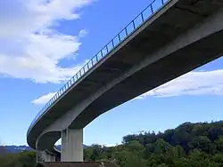 But with the revolutionary new material — prestressed concrete — Menn saw that prestressing could actually replace the arch itself. The prestressed deck of his arch bridge could become the main supporting member without the arch. His Felsenau Viaduct (1974) at Bern did exactly that — the roadway was carried solely by a curved hollow-box beam that has been prestressed. The effect is a structure of exceptional lightness that satisfies all three of Menn's main criteria for design: efficiency, economy, and aesthetics.[5] It is the longest viaduct of the A1 highway and the world's first single-cell box girder bridge built with the cantilever method, a pioneer work in prestressed concrete design and construction.[6]
