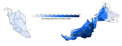 Christianity is the third-largest religion in Malaysia. In the 2020 census, 9.1% of the Malaysian population identified themselves as Christians.[1] About two-thirds of Malaysia's Christian population lives in East Malaysia, in the states of Sabah and Sarawak. Adherents of Christianity represent a majority (50.1%) of the population in Sarawak, which is Malaysia's largest state by land area. Christianity is one of four major religions, including Islam, Hinduism, and Buddhism, that have a freedom protected by the law in Malaysia based on diversity law especially in East Malaysia.[2]