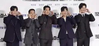The main cast at the film press conference. From left to right: Song Geon-hee, Kim Young-min, Park Jin-young, Kim Dong-hwi, and Heo Dong-won.