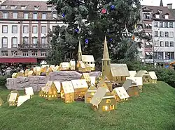 Illuminated house models at the foot of the tall Christmas tree in Strasbourg, France
