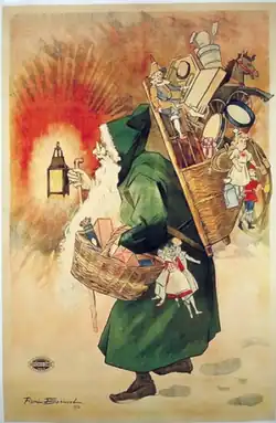 Père Noël (French pronunciation: [pɛʁ nɔ.ɛl]), "Santa", sometimes called Papa Noël ("Father Christmas"), is a legendary gift-bringer at Christmas in France and other French-speaking areas, identified with the Father Christmas or Santa Claus of English-speaking territories. According to tradition, on Christmas Eve children leave their shoes by the fireplace filled with carrots and treats for Père Noël's donkey, Gui (French for "Mistletoe") before they go to bed. Père Noël takes the offerings and, if the child has been good, leaves presents in their place. Presents are traditionally small enough to fit in the shoes; candy, money, or small toys.[1]