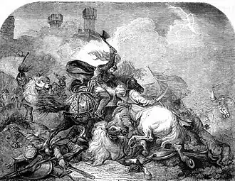 Depiction of the death of Simon de Montfort during the Albigensian Crusade, by Alphonse-Marie-Adolphe de Neuville, dated 1883.
