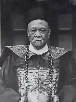 On 24 March 1921, His Highness Iskandar Shah K. C. M. G., the Sultan of Perak, with the advice of Colonel W. J. P. Hume, British Resident, Perak, conferred on him the title of "Kapitan China", in all probability, the last of the Chinese Kapitans in Malaya.[67][68][69] He was installed by the Sultan of Perak in Kuala Kangsar amidst much traditional pomp and pageantry. His appointment was so popular with the community that he was escorted to Kuala Kangsar by the delegates of more than 70 Chinese organisations from Perak.[70]