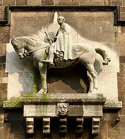 The equestrian sculpture on the wall of the southern steeple was placed there in 1909. It shows the Prussian field marshal Helmut Graf von Moltke and was donated by the banker Bernhard Loose from Bremen, who already died on 31 March 1902. It was designed by Heinrich Jennen from Berlin-Charlottenburg and sculpted by Hermann Hahn of Munich. Like the sculpture itself, the inscription above it expresses the militarism of the period: