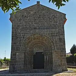 The longitudinal plan of the church is composed of a single-nave and rectangular presbytery (which is lower and narrower), with northern sacristy and tiled roof.[1] Its principal facade terminates in the gabled roof and includes a central portico on the ground floor, consisting of four columns supporting an architrave with decorative zoomorphic motifs.[1] The columns of this portico are decorated with monkeys, human figures (interpreted as the Virgin Mary and Angel Gabriel), entwined serpents and eagles with their beaks within a cornucopia. The capitals are decorated in vegetal forms or zoomorphic patterns.[1] The first archivolt has a rosetta and rings, the second monkeys, the third monoliths and human figures.[1] The tympanum includes a central figure of Christ secured by two angels.[1] These images imply a level of universal surrender of the human forms by figures within the archivolt, while others suggest that the figures represent the figures of the Apostles of Christ, who were depicted as being represented by the types of images.[1] Also problematic in this interpretation are the two figures of Mary and angel Gabriel (normally associated with the Annunciation) and who Lourenço Alves interprets as monks.[1]