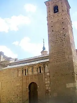 As with most of the Mudéjar churches in Toledo, it presents a simple aspect. Its main entrance, unique in Toledo, is in Almohad style bearing uncommon small green ceramic in columns on the door. The capitals are Visigothic. Its mosque past is being represented by a funeral pilaster.[2]
