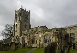 Whilst the present church dates back to the 13th century, additions and restorations were carried out in the 14th, 15th and 19th centuries.[9] The nave and north aisle date to the 12th/13th century whereas the south aisle and south chapel were constructed around 1290.[10] As with many churches of its time, additions and extensions were added at different dates; in the late 12th century the chancel was extended southwards into the south chapel (later the Lady Chapel), with the south aisle and chapel being rebuilt in 1290. As such, the church displays three different types of architecture; Decorated, Early English and Perpendicular.[11] Detailed structural analysis estimates that the original Anglo-Saxon church on the site has been suggested to have been 48 feet (15 m) long, 24 feet (7.3 m) wide and 24 feet (7.3 m) tall.[12] The present church is 120 feet (37 m) long, 61 feet (19 m) wide, with the tower height being 98 feet (30 m) high.[13] It is dedicated to Saint Gregory, but the date of dedication is unknown. It was known as the Church of St Gregory when Brian de Thornhill was rector in the 14th century, but the earliest written confirmation occurs in 1547 when it is specifically mentioned in a will.[14]