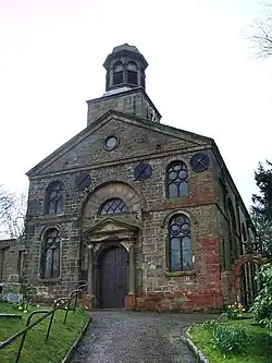 The church is built in squared sandstone, it has dressed quoins, and its roof is probably of slate, although this is obscured by the parapet. Its architectural style is simple Classical. The church has a rectangular plan with a three-bay nave, a two-bay chancel, and a vestry. Around the church is a string course, and at the top is a moulded cornice and a plain parapet. The west front is in two storeys, with a central entrance surrounded by a Tuscan architrave containing a round-headed doorway. This is contained within a round-headed blind arch in which is a lunette. The entrance is flanked by two two-light windows, also round-headed, and containing circular tracery, and there are two similar, but smaller, windows in the storey above. Also in this storey are three tie-bars. At the top of the west front is a pediment containing a round window. On the roof is a bell turret surmounted by an octagonal cupola. Along the sides of the church are windows similar to those in the west front. In the east wall of the chancel is a Venetian window.[6]