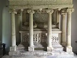In a recess within the Norman porch of the church is the tomb of Sir John Newton who died in 1568. He is depicted in armour, lying beside his wife, Margaret, daughter of Sir Anthony Poyntz. The two panels in front of the tomb depict his eight sons and twelve daughters kneeling.[3] It is covered by a canopy supported by six fluted Ionic columns.[1] It was previously where the altar stands and was moved to the porch in 1883.[1][4]
