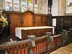 The carved wooden pulpit shows Jesus with children and the Woman of Samaria and is probably 18th century Flemish. It was purchased by Frank Shuttleworth from an antique shop in Edinburgh. Originally it had carvings of the signs of the Four Evangelists on the four pilasters but these were stolen in 1997.[3] The wooden panels on the front of the altar are late 19th century. The serpents on the front pew are of particular note. One was damaged during the burglary of 1997 and was repaired by local craftsmen while the second was stolen and subsequently replaced. The large box pew at the top of the nave opposite the pulpit was the Shuttleworth Family pew and contains a fine carving of the Women preparing the body of Christ. Above this is a large and ornate baroque carving representing Faith, erected by her sister in memory of Caroline Jane Shuttleworth, who died in 1899.[4]
