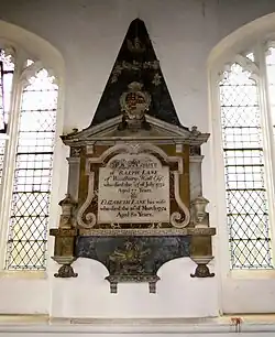 In the chancel on the south wall can be found a wall monument to Ann Say of 1793, with an oval inscription panel of white marble against a grey background. In the north aisle wall where it meets the north chapel can be found a mutilated tomb recess with an incomplete moulded trefoil head and a portion of a 13th-century coffin lid with a plain cross. In the south aisle on the south wall is a polychromatic wall monument to Ralph Lane of Woodbury Hall (1732) and his wife Elizabeth (1754). Nearby is another wall monument to their daughter Elizabeth Lane (1717). In the south chapel on the east wall is a small painted wooden panel to Phillip Burton (1683). The church also has a number of ledger stones, with one in the chancel dedicated to Dixie Windsor (1743) with an achievement of arms. A second to Thomas Sclater (1696); a third to Edward Sclater (1688); a fourth to William Meadston (1683) with an achievement of arms; a fifth to Rev. Isaiah T[. . . . . . .] and Ma[. . .] his wife [dates illegible]; a sixth to Elizabeth E[kins] (1702), and a seventh to William S[pin]kes (1701). In the south aisle is another to Elizabeth (Bury) wife of Francis Jermin (1685). The voussoirs of both nave arcades show the traces of medieval painting in red ochre, with that on the north side in particular still being quite distinct.[1][2]