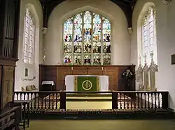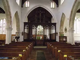 The rood screen is mainly late medieval, and is in five bays with the extra-wide middle bay being the entry. It has been much altered. The oldest parts are thought to have been in position after the restoration in the 1480s. Traces of the medieval paint colours of red, green, cream and gold still remain. At that time there would have been a small winding staircase (a vice) leading up to the top of the screen from behind the present pulpit. The doorway to the screen is still visible but the vice was bricked up in the Reformation. However the remains of the first few steps of the vice can be seen besides the modern pulpit.[4] The cornice infilling above the heads of the lights and gates are modern. In the north chapel can be found three remodelled pews, with an additional pew-end incorporated into modern seating. In the south chapel can be found two blocks of seating, each of four pews, similar to the seating in the north chapel but with original panelled fronts to the first pews. Nearby at the east end of the south aisle is a third panelled front incorporated into modern seating. With the exception of the first these seats are late medieval.[1][2]