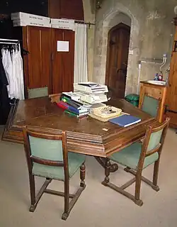 The present vestry dates from the 1880 restoration while the unusual shape of the vestry table leads us to believe it may be the sounding board of the pulpit prior to that presently used, the old pulpit having come from Ely House in Holborn.[4]