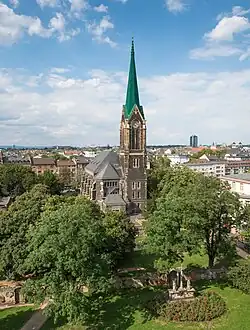 The church built between 1891 and 1894 on a neo-Renaissance design by Hans Grisebach and Georg Dinklage.It was built on the site of the historic St Peter's Churchyard (German: Peterskirchhof), where most of Frankfurt's dead was buried until 1828.[1]