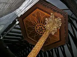 The pulpit, stairs and sounding board at St Peter and St Paul date from 1775. It was originally constructed for Westminster Abbey and was designed by abbey surveyor Henry Keene. In 1820, the pulpit was removed from the abbey to create space for the coronation of George IV, which took place in 1821. The pulpit was given to the owner of Court Lodge (the Bishop’s Palace until the end of the 13th century), adjacent to St Peter and St Paul, by abbey surveyor Benjamin Dean Wyatt and given to the church in 1824.[10][12][17]