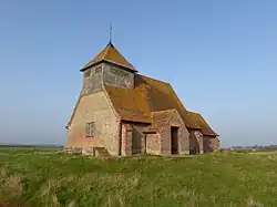 The Church of St Thomas à Becket is a parish church near the village of Fairfield, Kent, England. Standing in open marshland and accessible only by footpath, it is noted for its remote setting and has been a frequent subject for photographers, writers, and artists. The church was built in the 15th century on the site of an earlier church. It was renovated in the 17th century in accordance with the Laudian plan promoted by Archbishop William Laud, which adapted medieval interiors for Protestant worship. In the 18th century, the exterior walls were rebuilt in brick. By the 19th century, fewer than 24 dwellings remained in Fairfield parish, and by 1934, the parish was dissolved. In the early 20th century, the church underwent a major renovation. Many of the timbers were replaced and the exterior was clad with new brickwork. It is a Grade I listed building.
