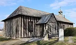 The Church of the Holy Family stands in central Cahokia Heights, at the southeast corner of East 1st and Church Streets. The church campus includes three buildings: the 1799 church, a modern 20th-century sanctuary, and a parish house. The 1799 church is a log structure, measuring about 32 by 74 feet (9.8 m × 22.6 m). It is built out of heavy walnut timbers that were hewn into rectangular shape and mortised into a wooden sill resting on stone slabs. The timbers are each about 14 feet (4.3 m) long, one foot wide and six inches thick, and are set about one foot apart. The spaces between them are filled with what was termed pierrotage, a mixture of rubblestone and clay. Each of the walls slopes slightly inward as it rises, and is braced by diagonal timbers. The roof trusses are of walnut and oak, and give the roof a bell-cast appearance.[5]
