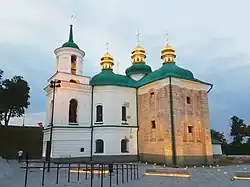 ![]() Side view of the Church of the Saviour in Berestove seen with its 19th-century steepled belfry. A portion of the wall cleaned from stucco belongs to the early 12th century. | |