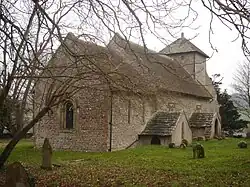 The church is aligned from east to west with its chancel and altar at the east end. It consists of a 12th-century chancel and plain, semicircular chancel arch; a nave of the same age, with two rectangular windows on each side; and a short tower from the 13th century, with two angled buttresses at the southwestern and northwestern corners. The former has a 13th-century gravestone incorporated into the stonework, but the buttresses are no earlier than 14th-century. On the north side is an entrance porch and a vestry.[1] Horsham stone tiles are used for the church and porch roofs and the shallow "Sussex cap"-style roof of the tower.[1][3]