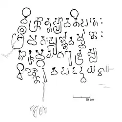 Ciaruteun inscription (Indonesian: Prasasti Ciaruteun) also written Ciarutön or also known as Ciampea inscription is a 5th-century stone inscription discovered on the riverbed of Ciaruteun River, a tributary of Cisadane River, not far from Bogor, West Java, Indonesia. The inscription is dated from the Tarumanagara kingdom period, one of the earliest Hindu kingdoms in Indonesian history.[1]: 15 The inscription states King Purnawarman is the ruler of Tarumanagara.