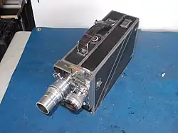 Earlier Kodak 16 mm movie cameras, including the Ciné-Kodak Models B, F and K, shared a common design, being rectangular boxes with a top-mounted handle and a lens extending from the smallest side, similar in shape to a briefcase but smaller.[1] The standard CKS camera had the same boxy rectangular design, but for the Special, this was formed from two joined modules: a spring motor unit and a film magazine. The spring motor half contains the film transport mechanisms and the user controls, including winding cranks, and gear work to the shutter. Two film magazine halves were available, holding either 100 or 200 feet (30 or 61 m) of film; either can be docked to the motor/control half.[2] This allows the cinematographer to pre-load multiple magazines of film for quick interchange of film.