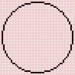 Rasterizing a circle of radius 23 with the Bresenham midpoint circle algorithm. Only the green octant is actually calculated, it is simply mirrored eight times to form the other seven octants.