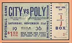 A game ticket to the 1936 matchup between Baltimore City College and Baltimore Polytechnic Institute.