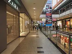 The shopping centre consists of three floors with over 110 businesses, cafés and restaurants with a total shopping area of 30 thousand square metres.[1] There are about 880 for-pay parking spaces on two floors. Two prevent traffic congestion, St. Veiter Ring was widened to four lanes in the area around City-Arkaden. Directly in front of the main entrance is the bus stop "Heuplatz" where the Klagenfurt city buses 40 and 41 stop every 7 to 15 minutes in directions of the Klagenfurt railway station, Annabichl and Feschnig.