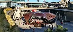 The total GLA of the Podium is about 20,000 m2 (220,000 sq ft) and includes retail, multiplex cinema, food court. The structure is based on framed schemes, made by steel girders and concrete slabs on folded plates, arranged in a composite structural mechanism. The structure is crossed by a major point of the substructure, so that horizontal stability is achieved by the use of separate systems—combination of concrete cores and steel bracings—for the two halves of the structural body. The column arrangement has to follow the free-form internal space and to match with the substructure structural grid. As a result, spans are variable and many areas feature very long spans and cantilevers, which are solved by using truss girders in plane and spatial arrangements. The façade structures must allow free movements of the superstructure and follow the outer skin shape, and are based on vertical frames of variable shape, mostly following hybrid truss and beam schemes.
