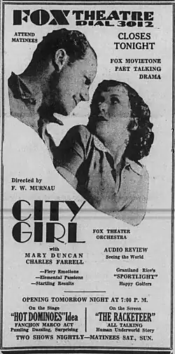 City Girl is a 1930 American part-talkie sound drama film directed by F. W. Murnau, and starring Charles Farrell and Mary Duncan. It follows a waitress in Chicago who falls in love with a farmer in Minnesota and leaves her life in the city to be with him. It is based upon the play "The Mud Turtle" by Elliot Lester. Though shot as a silent feature, the film was refitted with some sound elements and released in 1930 as a sound film due to the public apathy to silent films. While the film has a few talking sequences, the majority of the film featured a synchronized musical score with sound effects using both the sound-on-disc and sound-on-film process.[3][2]