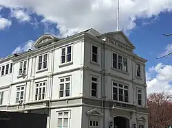 The eastern or inshore end of Pier A was constructed in 1900 as a square two-story annex, which was expanded to three stories in 1904.[19][20] It extends about 50 ft (15 m) inland.[6][20] The inshore annex's facade is divided vertically into three bays each on its northern, eastern, and southern elevations.[19] The bays are divided by one-story pilasters, and a cornice runs above the third story.[20] The eastern elevation includes a large archway on the ground floor (originally used by horse-drawn carriages), which is flanked by smaller openings with architraves. On the second and third stories of the eastern elevation, there is a triple window in the center bay and a single window on either side.[19] Above the third story, the center bay contains a triangular pediment with seashell decorations, originally decorated with the letter "A".[6][19][20] On the northern and southern elevations, the inshore annex has a double window in each bay, as well as a segmentally arched pediment at the center above the third story. The inshore annex is topped by a gable roof.[20]