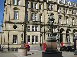The former Leeds General Post Office covers the northwest side of the square. It is a Grade II listed building, in classical style by architect Sir Henry Tanner. It is in Ashlar, with slate and lead roofs of four stories and two main entrances with columns on the square, with a central clock tower. There are other entrances to the sides on Quebec Street and Infirmary Street.[14] The telephone booths outside the former post office are K6 design and also Grade II listed buildings.[15]