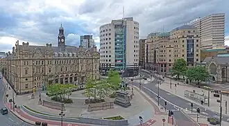 City Square is a paved area north of Leeds railway station at the junction of Park Row to the east and Wellington Street to the south. It is a triangular area where six roads meet: Infirmary Street and Park Row to the north, Boar Lane and Bishopsgate Street to the south-east, and Quebec Street and Wellington Street to the south-west.[1] The only building with a direct frontage is the former General Post Office, on the north-west side.
