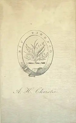 Christie is a shortened form of Christian and possibly also of Christopher, which is established in Fife and Stirlingshire[1] According to Scots Kith and Kin, Clan Christie was in the area of Fife in the 15th century. Said to be a sept of the Clan Farquharson. Another tradition is that the name was given to descendants of Christianus, a younger son of Alwyn II, one of the first Earls of Lennox.[2] Anderson describes four coats of arms belonging to four different Christie families in Fife, Mid-Lothian, Aberdeen, and Galloway. Rogers[3] states that the name may have come from the Danish word "cruset" which means "cup"; and there was a family of Christie on the Isle of Man, who claimed descent from the Danes. Anderson reports that the last recognized head of the Clan Christie was Sir Archibald Christie who was deputy-governor of Stirling Castle, and who died in 1847.