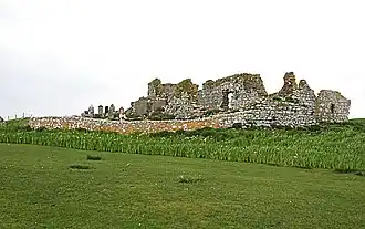 Ruinous Dunscaith Castle, Skye. The castle was once a MacLeod stronghold.[18] It became the earliest seat of Clann Ùisdein in the lands of Sleat.[5]