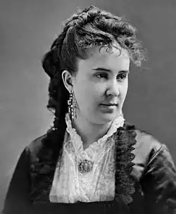 Clara Louise Kellogg was born in Sumterville, South Carolina, the daughter of Jane Elizabeth (Crosby) and George Kellogg. She received her musical training in the Academy of Music, New York City, and first sang opera there in 1861.[1] Her fine soprano voice and artistic gifts soon made her famous. She appeared as prima donna in Italian opera in London and at concerts in 1867 and 1868, and from that time till 1887 was one of the leading public singers. She appeared at intervals in London, but was principally engaged in America.[2]