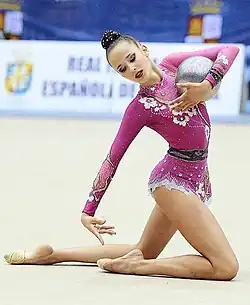 On March 29, 2014, she made her debut as a member of the senior group in an exhibition in Vera within the framework of the Spanish Championship for People with Intellectual Disabilities, where she performed the 10 clubs exercise.[11] In April, she participated in two exhibitions with the reserve team on the International Day of Sport for Development and Peace, organized at the CSD, and in 10 clubs at the Queen's Cup in Guadalajara. In June, she was honored at the closing ceremony of the course at the Municipal School of Torrevieja, where she started.[12] In September she travelled to Izmir to support her teammates, who became world champions with 10 clubs for the second consecutive time, and in November she performed with Marina Viejo at the Royal Order of Sporting Merit award ceremony.[13] On December 20, 2014, she participated with the rest of the group in the tribute to her coach, Sara Bayón at the Marta Domínguez Pavilion in Palencia, performing two exhibitions.[14][15][16][17]