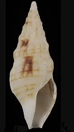 The size of an adult shell varies between 8 mm and 25 mm. The thick shell is whitish, irregularly variegated with a few large squarish brown spots. The upper portion of the whorls is smooth, concave, below the periphery with numerous narrow ribs. The anal sinus is broad.[2]