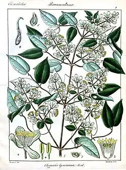 A large climbing shrub, reaching up to the canopies of trees. Glabrous, except for the younger parts of the plant. Grooved stem and branches. Leaves are pinnate, sometimes bi-pinnate or tri-pinnate. Leaflets may be ovate or oblong acuminate, with nerves and reticulate venation, and have a shining surface. Small flowers in many branched pannicles. Each flower is 1 to 1.5 inches wide, fragrant and greenish-white. Petals are absent but four greenish sepals present which are oblong-ovate and covered with soft down. Many stamens, with free, narrow and straight filaments which thicken towards the top. Compressed achenes, narrowly ovoid or oblong, with persistent feathery style.[1][2][6][7][8]
