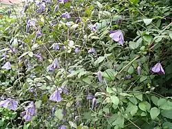 Clematis viticella, the Italian leather flower,[1] purple clematis,[2] or virgin's bower, is a species of flowering plant in the buttercup family Ranunculaceae, native to Southern Europe and Western Asia, from the Italic Peninsula to Iran.[3] This deciduous climber was the first clematis imported into English gardens, where it was already being grown in 1569 by Hugh Morgan, apothecary to Elizabeth I.[4] By 1597, when it was already being called "virgin's bower", there were two varieties in English gardens, a blue (actually a purple-blue) and a red.[5][6]