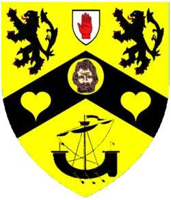 Or on a chevron between two lions rampant in chief and a lymphad in base Sable a bezant charged with a representation of the head of St John the Baptist Proper between two hearts of the field.