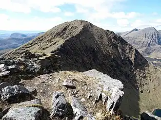 To the southwest of Cnoc na Péiste is the peak of Maolán Buí (973 m or 3,192 ft) and a generally flat grassy ridge to the col at the Devil's Ladder.[7] To the northeast is the narrow sharp rocky arête that joins with The Big Gun (939 m or 3,081 ft), and Cruach Mhór (932 m or 3,058 ft), which marks the end of the eastern ridge of the Reeks.[7]