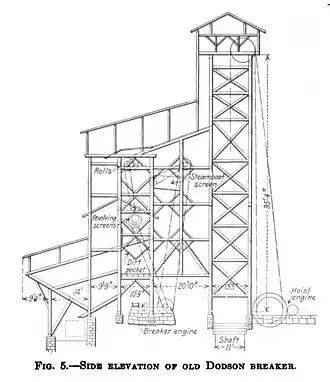 On July 13, 1899, the first Dodson breaker burned down, and on March 5, 1900, work began on the second breaker.[59] In 1914, Plymouth Borough obtained an injunction preventing the Plymouth Coal Co. from mining, owing to surface subsidence, and for most of that year the mine was idle. In January 1915, the Kingston Coal Co., which operated the adjacent Gaylord Colliery, announced it would buy the Dodson mine.[60]