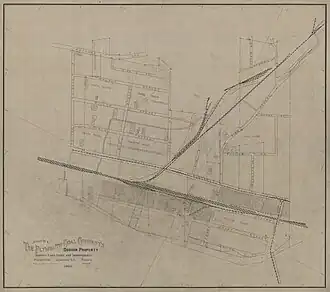 The Parrish Colliery was a relative late-comer to Plymouth. Its origins can be traced to the sale by the Wadhams family of their homestead farm in 1871 to the Wilkes-Barre Coal & Iron Co. The property was located in the center of Plymouth Borough, between Academy and Girard streets. In 1874, the Wilkes-Barre Coal & Iron Co. became part of the Lehigh & Wilkes-Barre Coal Co., which acquired the property, but by some arrangement the mine was operated by the Parrish Coal Co., organized in 1884. The company built a breaker, said to be "a model of neatness,"[50] built by contractor Joseph C. Tyrrell and completed in September 1884.[51] On the night of January 25, 1887, the new breaker caught fire and was completely destroyed. Another was built and was operating by July.[52]